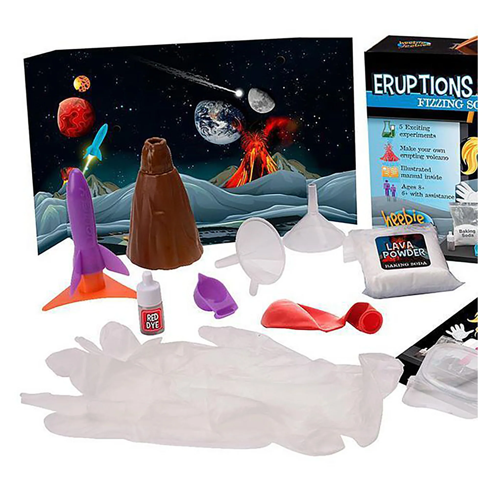 The Eruptions and Explosions kit is perfect for any budding scientist that loves to get hands on and watch experiments bubble and fizz. Complete 5 experiments, including launching a rocket, making a volcano, and inflating a balloon without blowing all using the reaction of bicarbonate and vinegar.After you've done each experiment, you can learn about how volcanoes, rockets and natural forces work with an educational booklet inside. This is the perfect fun STEM learning tool for both girls and boys.The kit comes with a model volcano, rocket, chemicals, and equipment including protective goggles and gloves.